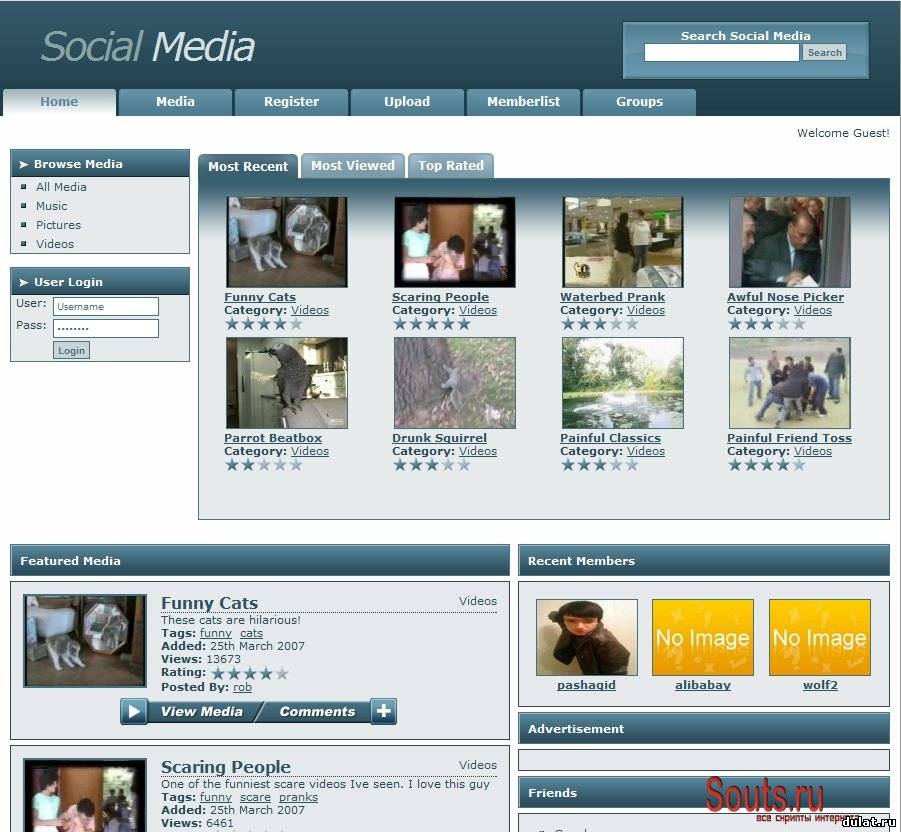 Пользователи могут добавлять изображения,видеоролики, музыку.Скрипт немного напоминает youtobe .